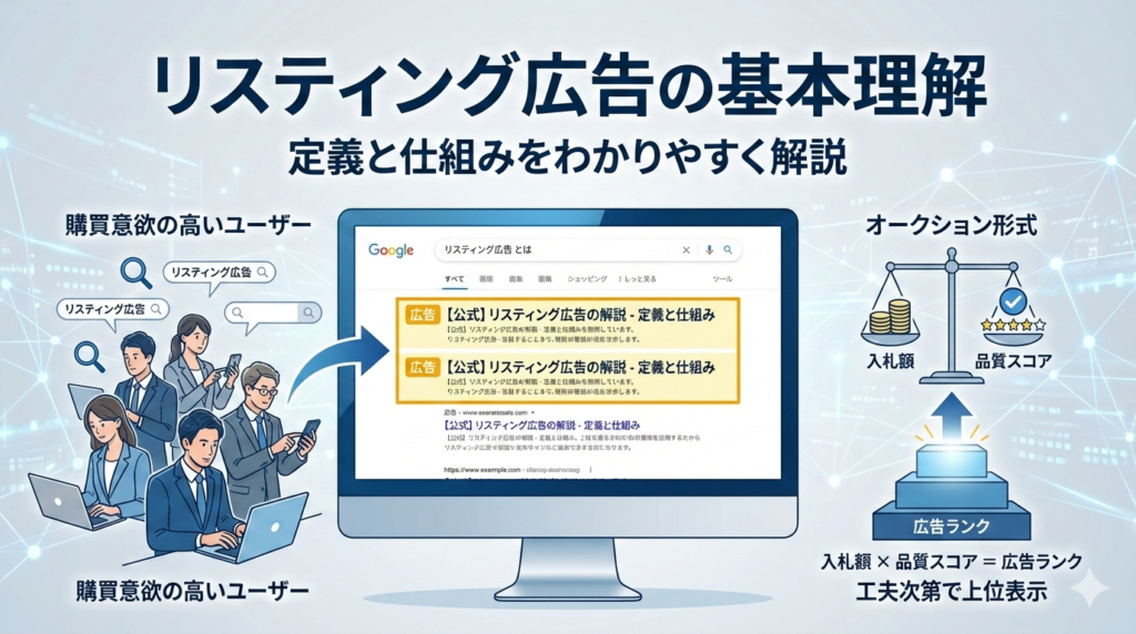 まずは、リスティング広告の基本的な定義と仕組みについて解説する。Web広告の中でも特に利用頻度が高い手法であるため、正しく理解しておくことが重要だ。