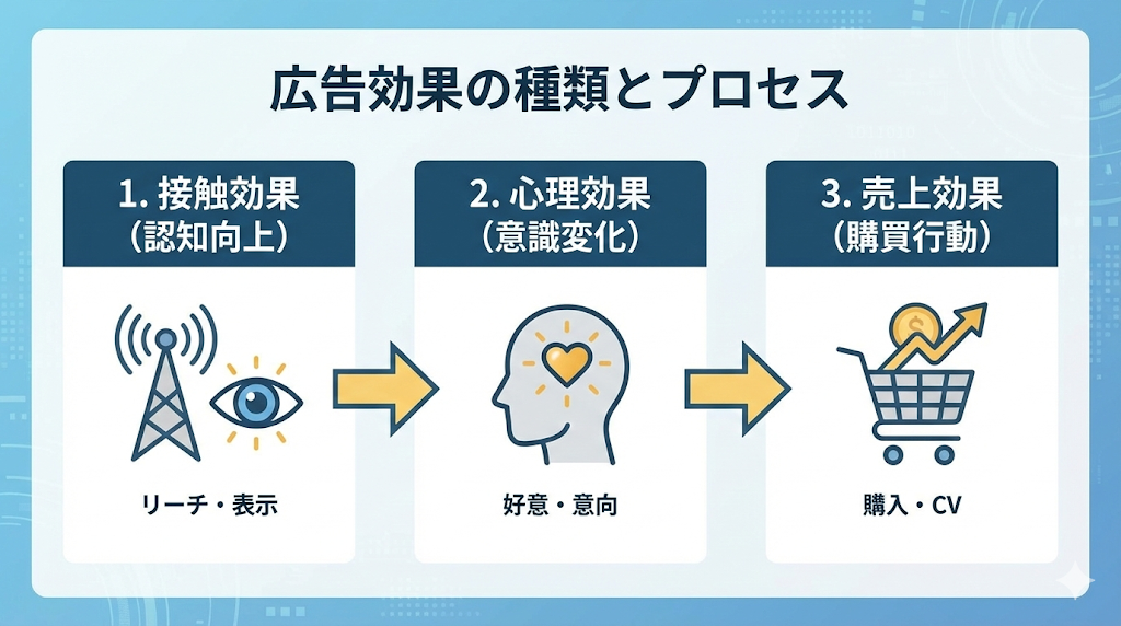 広告効果とは、広告の出稿によってターゲットとなる消費者の態度や行動にどのような変化が生じたかを示す指標のことです。単に「広告を出した」という事実だけでなく、それによって「どれだけの人が認知したか」「どれだけの売上につながったか」を数値化し、比較検証することを指します。