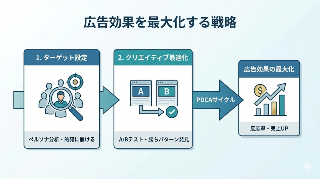 具体的なターゲット像(ペルソナ)を明確にし、年齢・性別・居住地などのデモグラフィックデータだけでなく、興味関心や行動パターンまで分析します。ターゲットの悩みやニーズに合致したメッセージを届けることで、反応率は劇的に向上します。また、広告配信後もターゲットの反応を常にモニタリングし、設定を微調整していくPDCAサイクルが欠かせません。