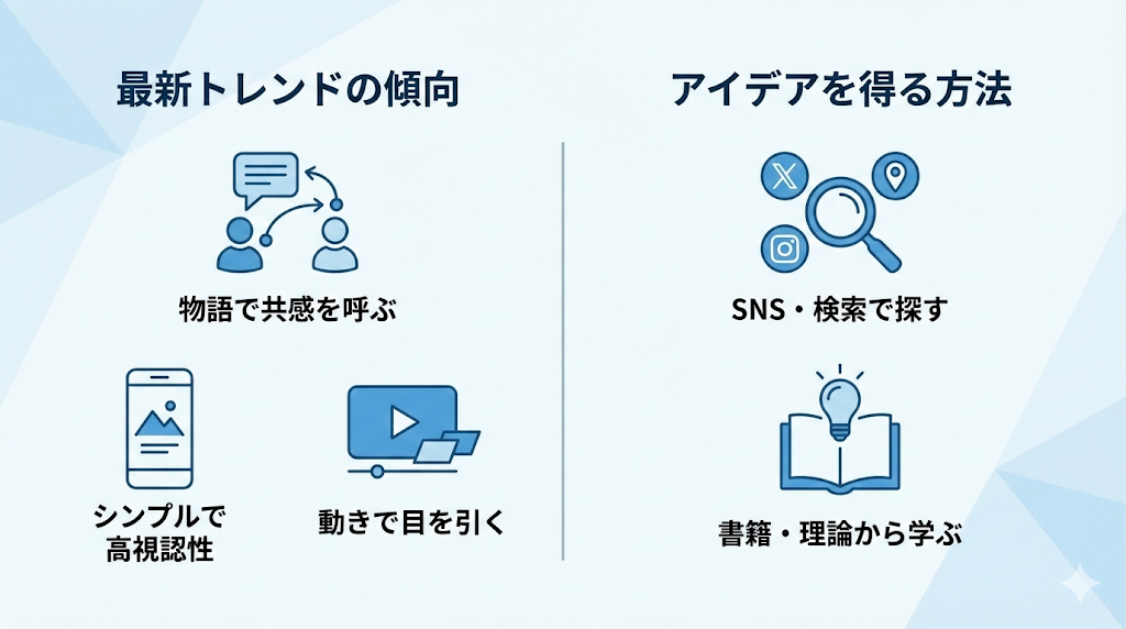 広告業界のトレンドは移り変わりが早く、常に最新のスタイルを把握しておく必要があります。時代に合わないイラストを使用すると、ブランド自体が古臭い印象を持たれてしまうリスクがあります。ここでは最新のトレンドと、アイデアを得るための方法を紹介します。