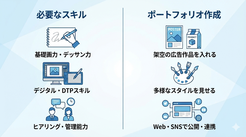 広告イラストを制作する側(イラストレーター)を目指す場合、どのようなスキルや準備が必要なのでしょうか。発注側にとっても、クリエイター選びの基準を知る上で役立つ情報です。