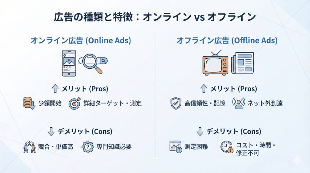 広告は大きく分けて「オンライン広告(Web広告)」と「オフライン広告」の2種類が存在します。それぞれの代表的な種類と特徴を解説します。