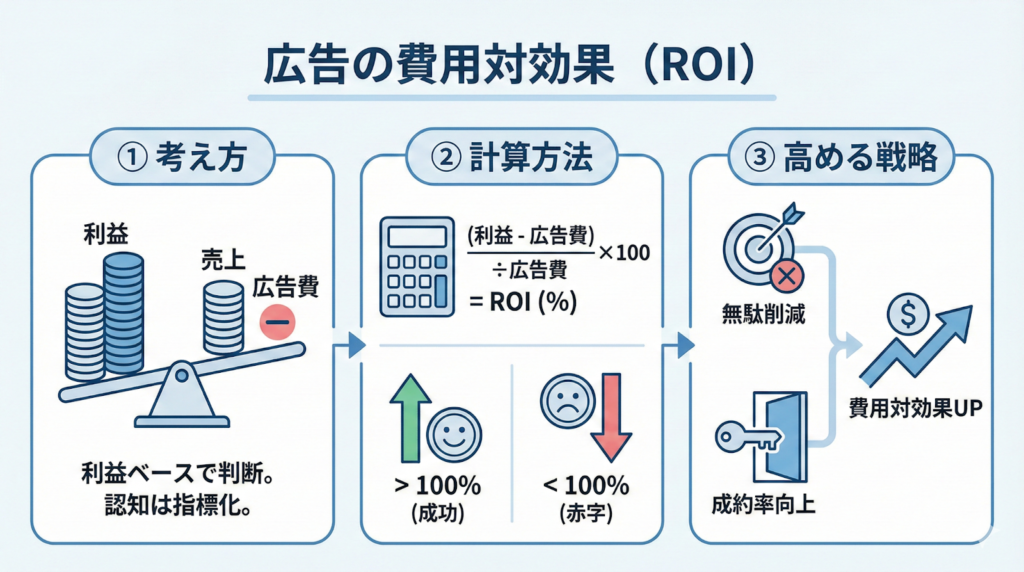 ROI(%) = (利益 - 広告費) ÷ 広告費 × 100