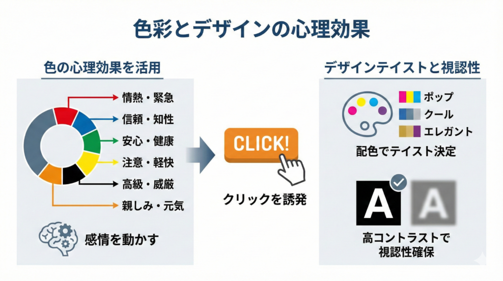 色は、文字の内容以上に直感的なメッセージを伝えます。色彩心理学を応用することで、ユーザーの感情を動かし、クリックを誘発することが可能です。