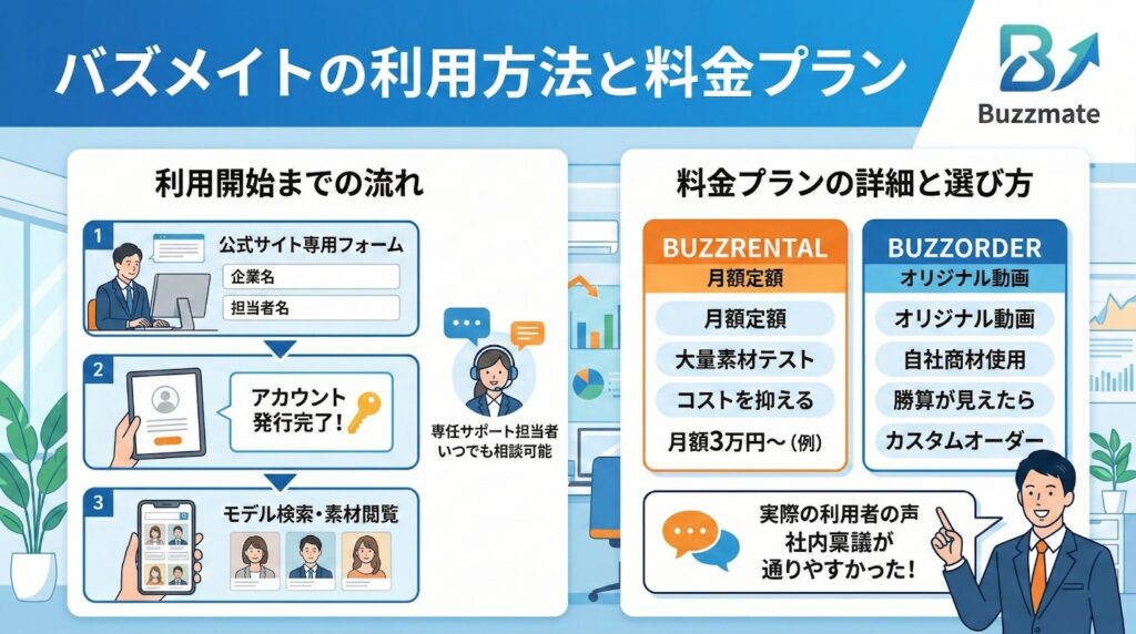 バズメイトには、企業のフェーズや広告予算に応じた複数の料金プランが用意されています。月額定額制の「BUZZRENTAL」は、コストを抑えて大量の素材をテストしたい企業向けです。
