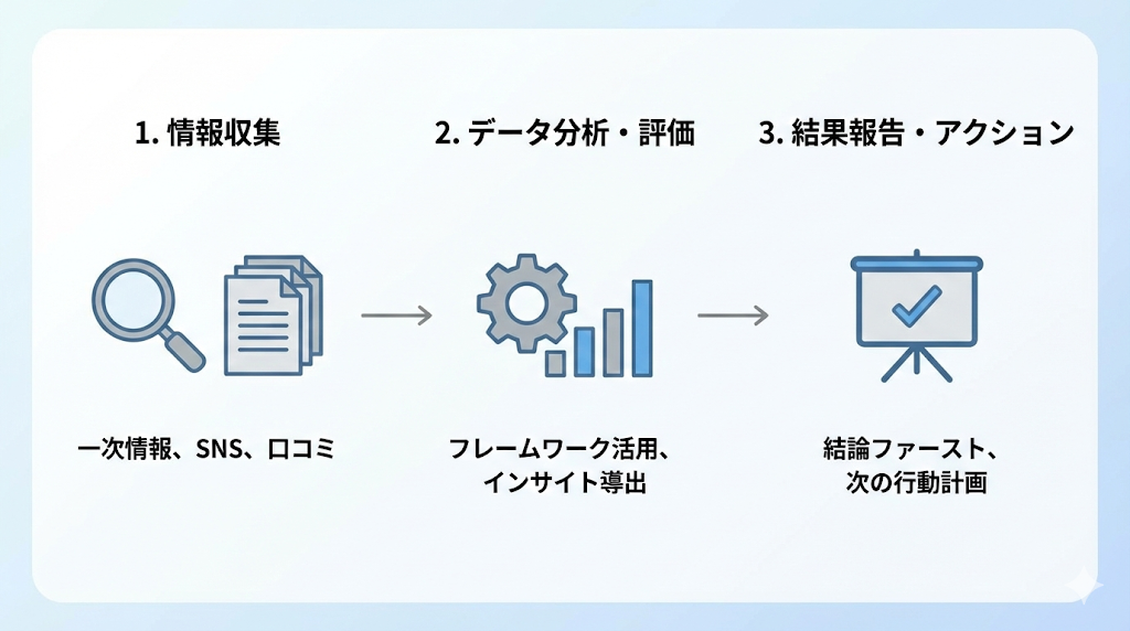 フレームワークを理解したところで、実際に分析を進めるための手順を解説します。正しいステップを踏むことで、分析結果の質が大きく向上します。