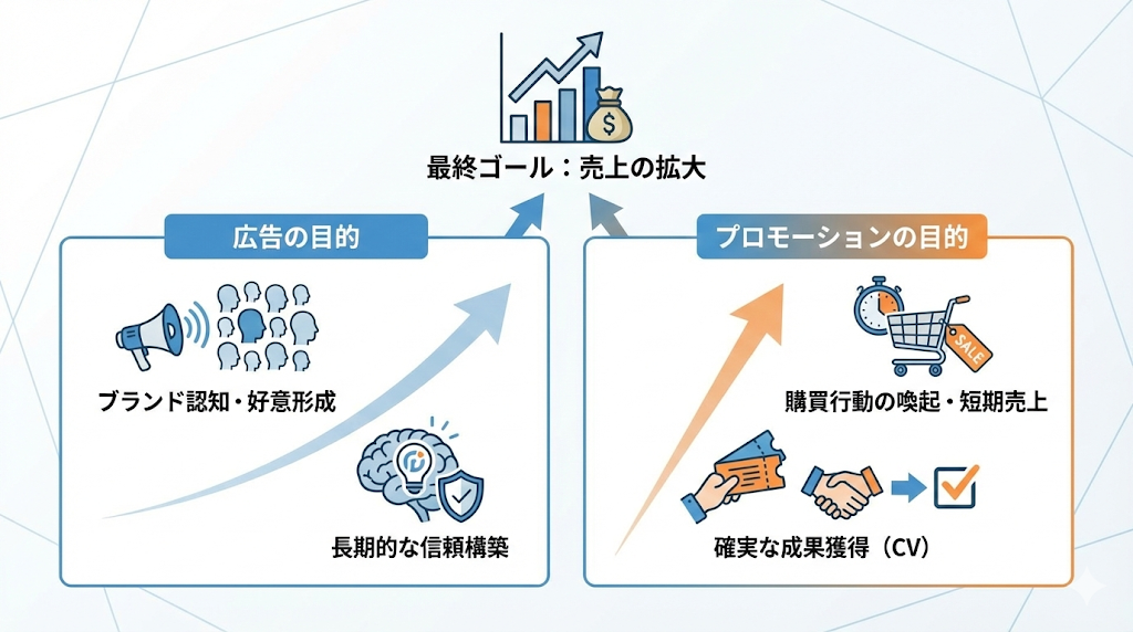 広告とプロモーションは、最終的なゴールこそ「売上の拡大」で共通していますが、そのプロセスにおける目的には明確な違いがあります。それぞれの目的を正しく理解することで、適切なKPI設定や予算配分が可能になります。