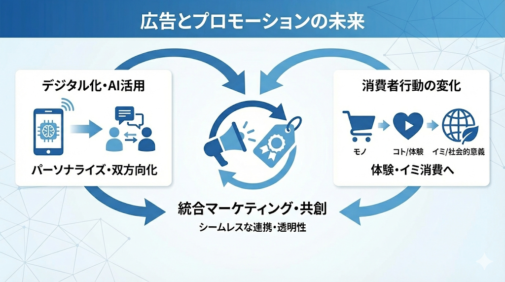従来のマス広告のような一方的な発信だけでなく、双方向のコミュニケーションが重要視されています。データ分析の精度が向上し、広告を見た人がその後どのような行動をとったか、リアルタイムで追跡できるようになりました。広告とプロモーションをシームレスにつなぎ、一気通貫で管理する「統合マーケティング」が求められています。
