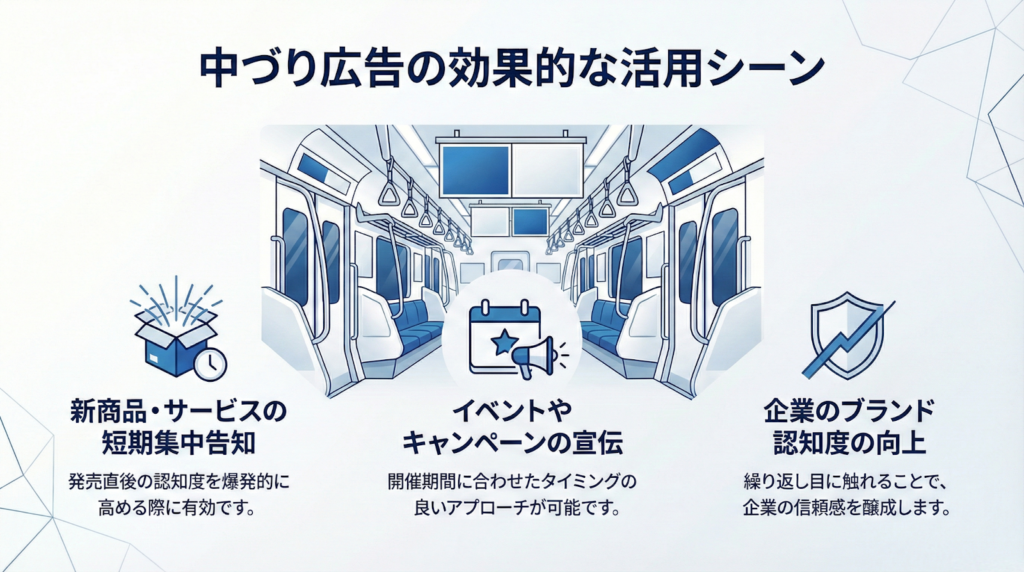 中づり広告の特性を活かすためには、目的に合わせた使い方が重要です。ここでは、特に相性の良い3つの活用シーンを紹介します。