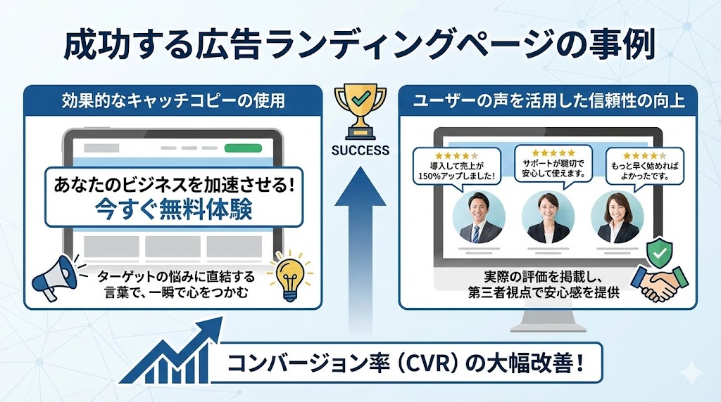 コンバージョンを量産している優れた広告ランディングページには、共通する勝ちパターンが存在します。実際の成功事例からエッセンスを学ぶことで、自社のページ改善に活かすことができます。成果を上げているページの具体的な工夫を紹介します。