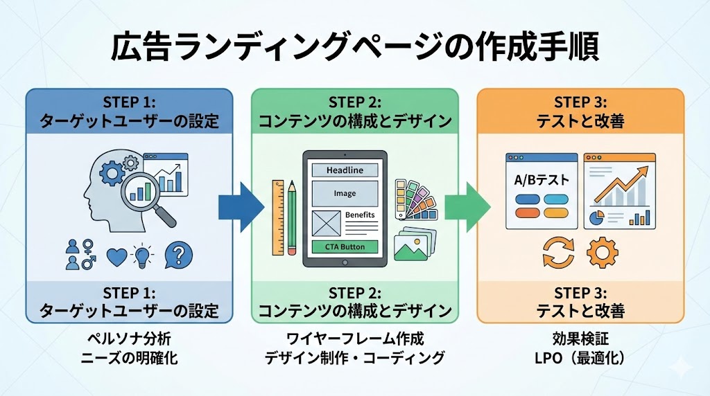 成果の出る広告ランディングページを作るには、正しい手順を踏む必要があります。デザインに手をつける前の、緻密な戦略設計が成否を分けるからです。ここでは、企画から公開に至るまでの具体的な作成ステップを紹介します。