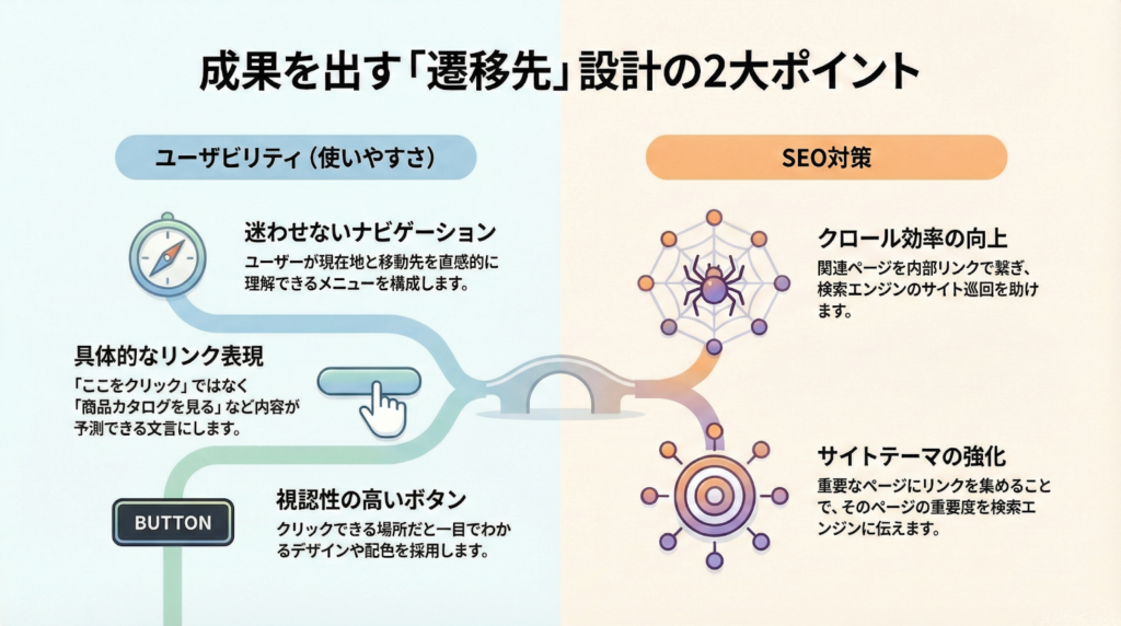 ユーザーにとっても検索エンジンにとっても使いやすいサイトにするためには、遷移先の設計が欠かせません。