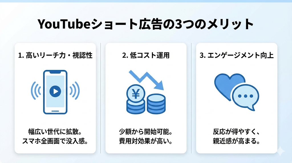 数ある広告媒体の中で、なぜ今YouTubeショート広告を選ぶべきなのでしょうか。主なメリットを3つ挙げます。