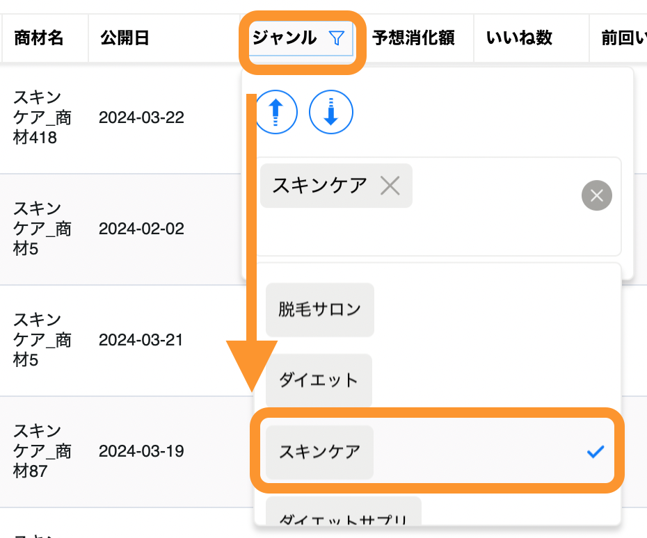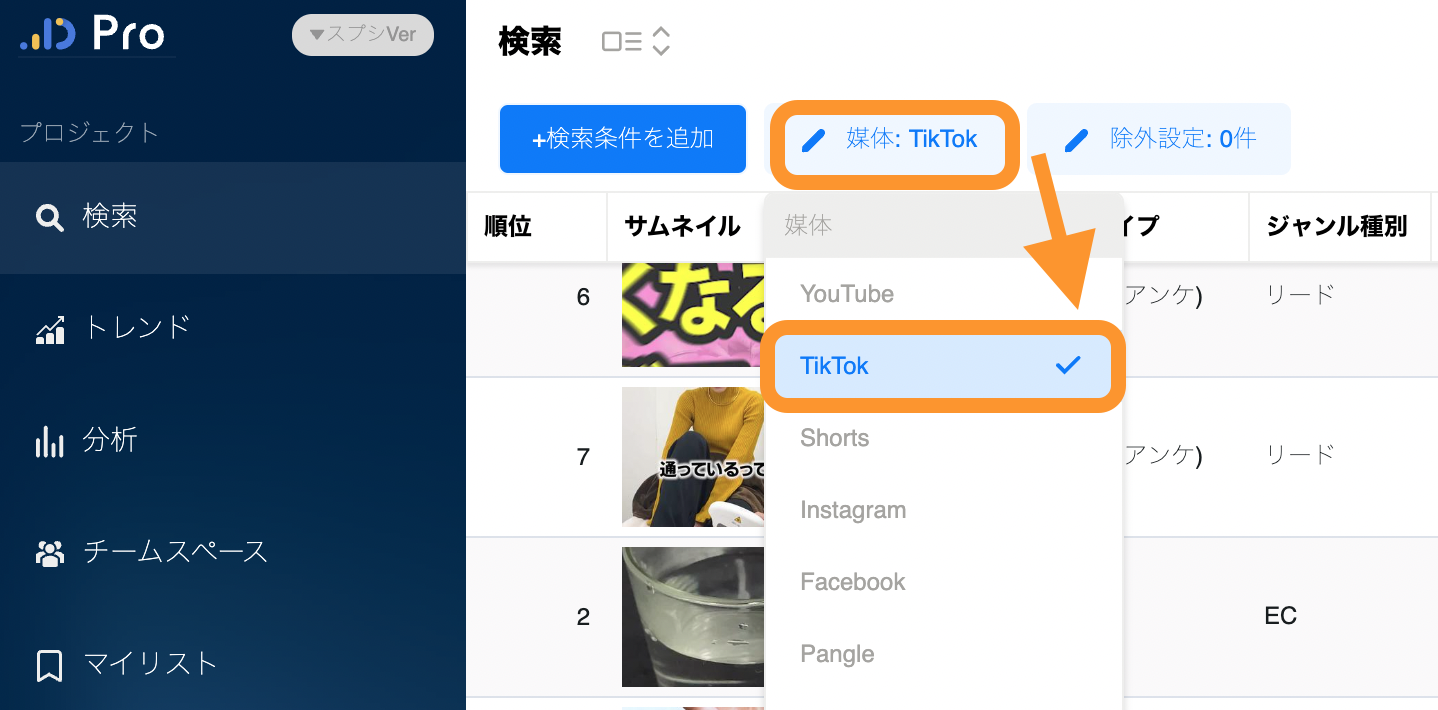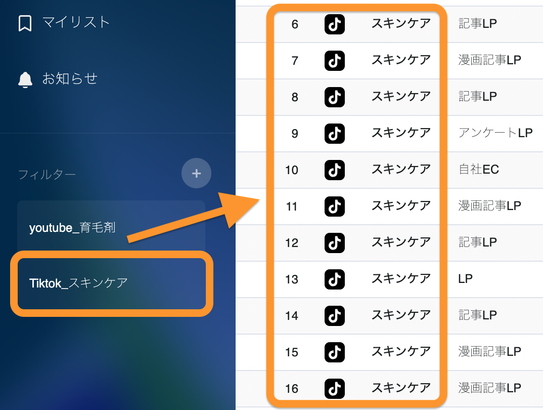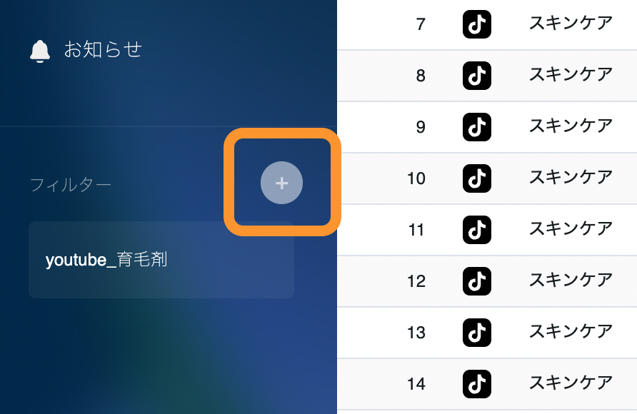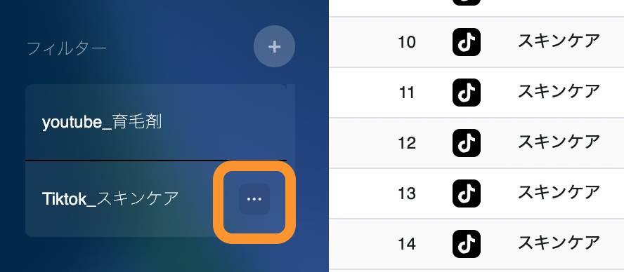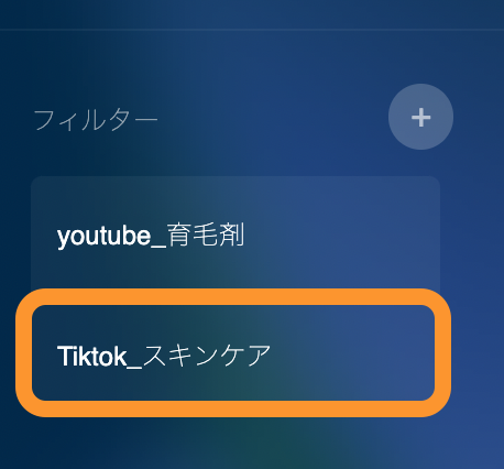例として、『Tiktok』の『スキンケア』という条件でフィルターを作成、保存してみましょう。