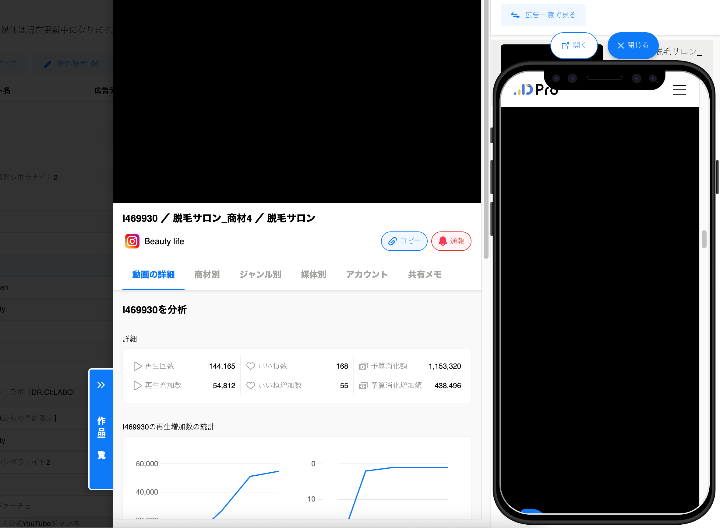 動画広告分析Proの使用中、稀に動画広告や遷移先が黒い画面のまま表示されない場合があります。