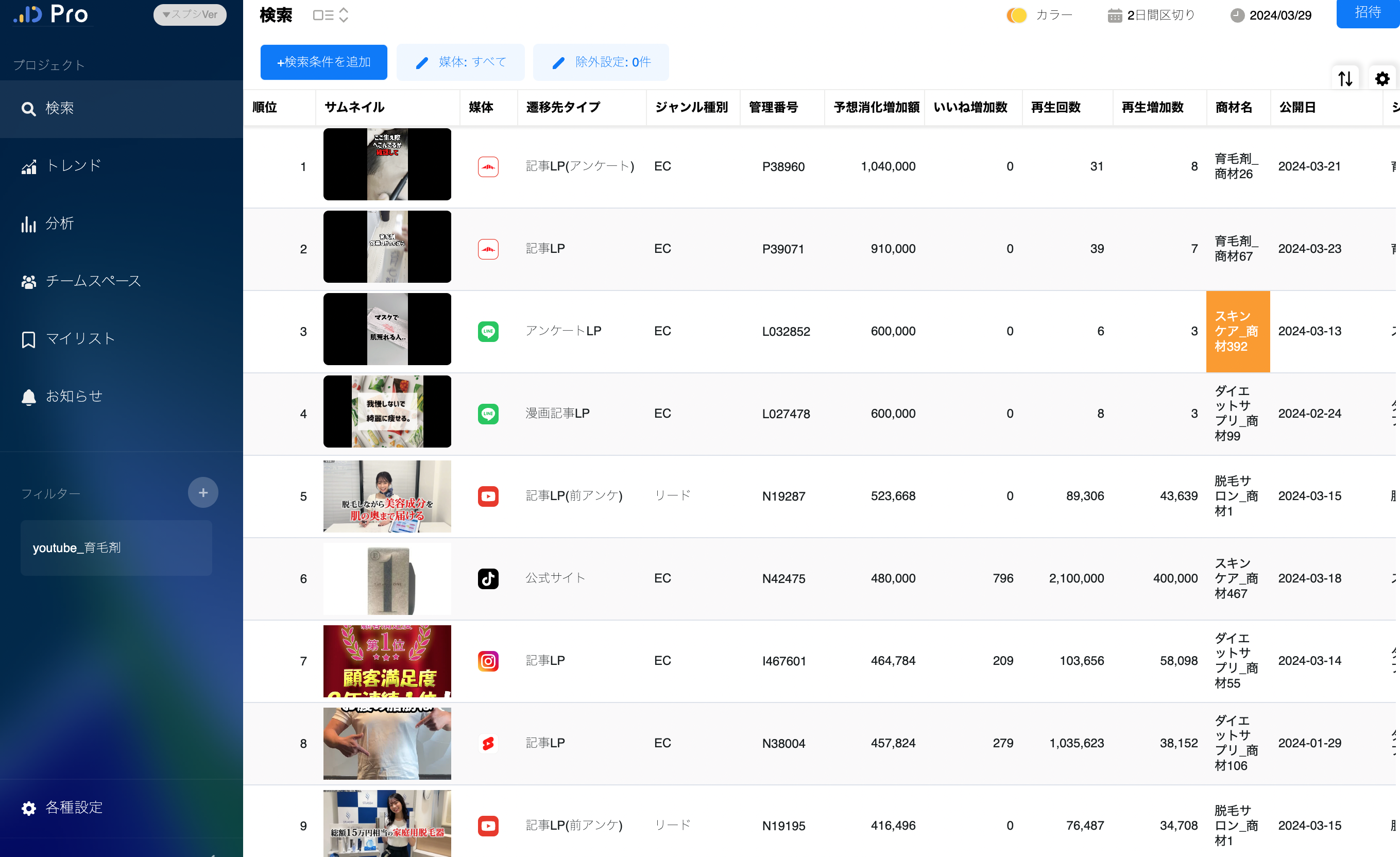 『動画広告分析Pro WEB版』では、これらの複数のプラットフォームにわたる統合されたデータ分析機能にあります。広告運用者は、さまざまな媒体のパフォーマンスを比較し、より効果的な広告戦略を立てることができます。