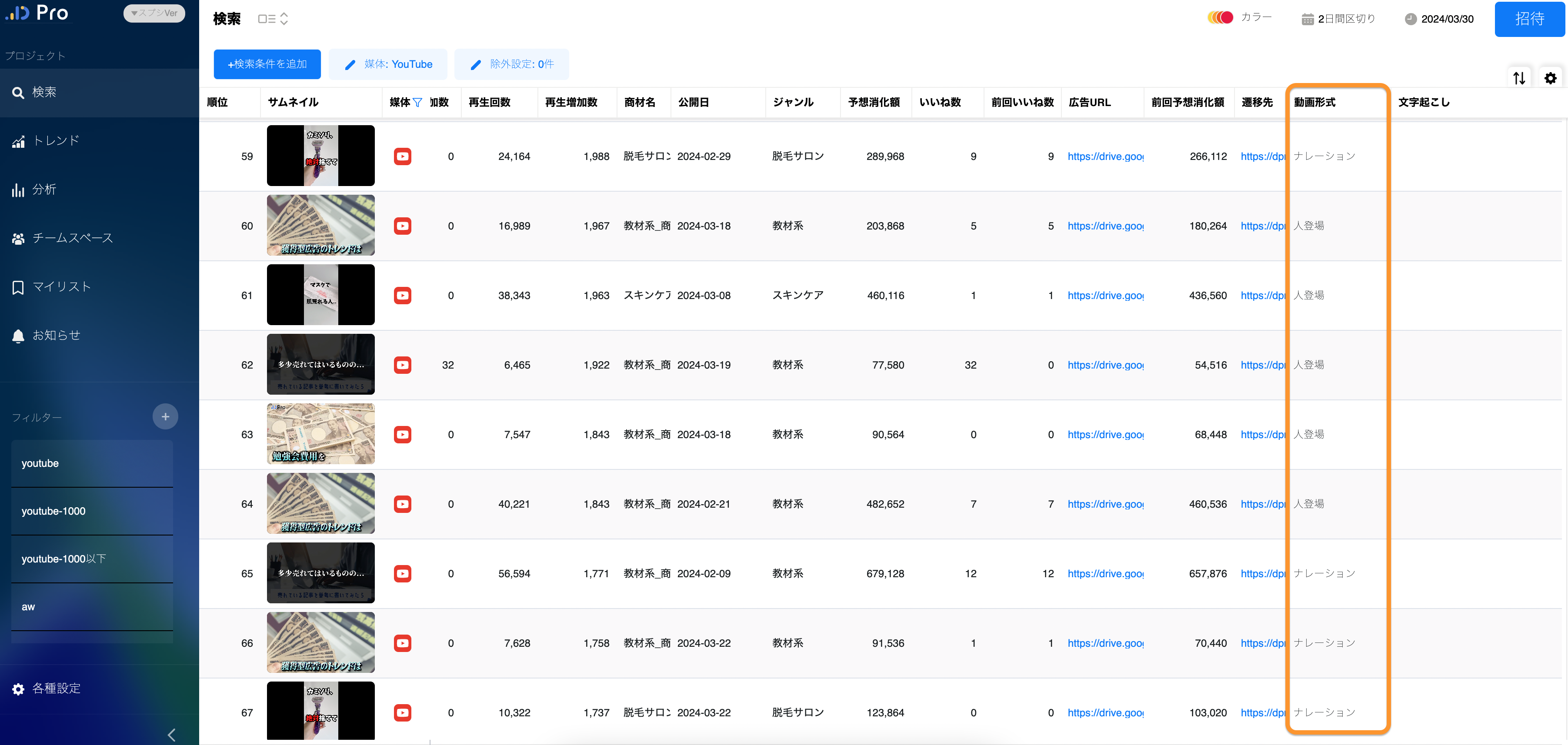 【動画形式】は、『YouTube動画広告における広告のスタイル』を指す分析項目です。動画形式は、広告の魅力、メッセージの効果、およびターゲットオーディエンスとの関連性に大きな影響を与えるため、重要な指標になります。