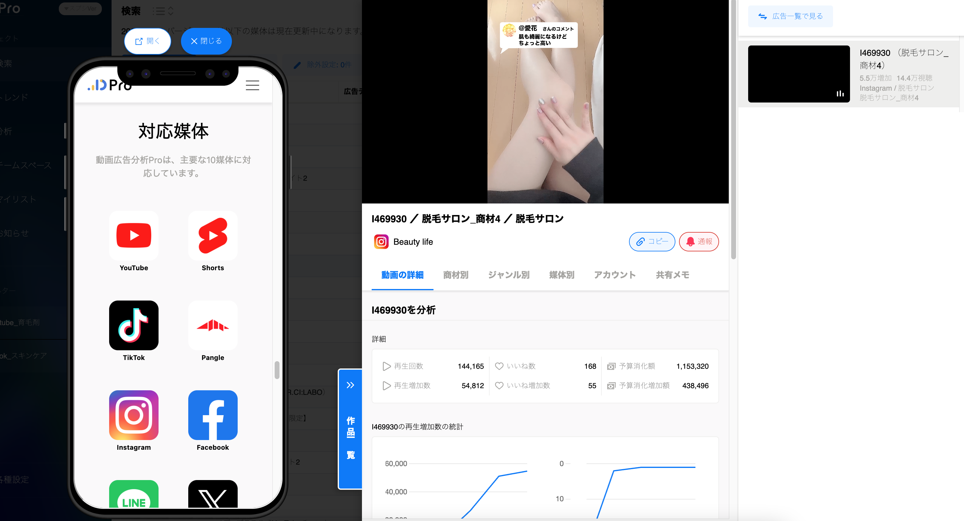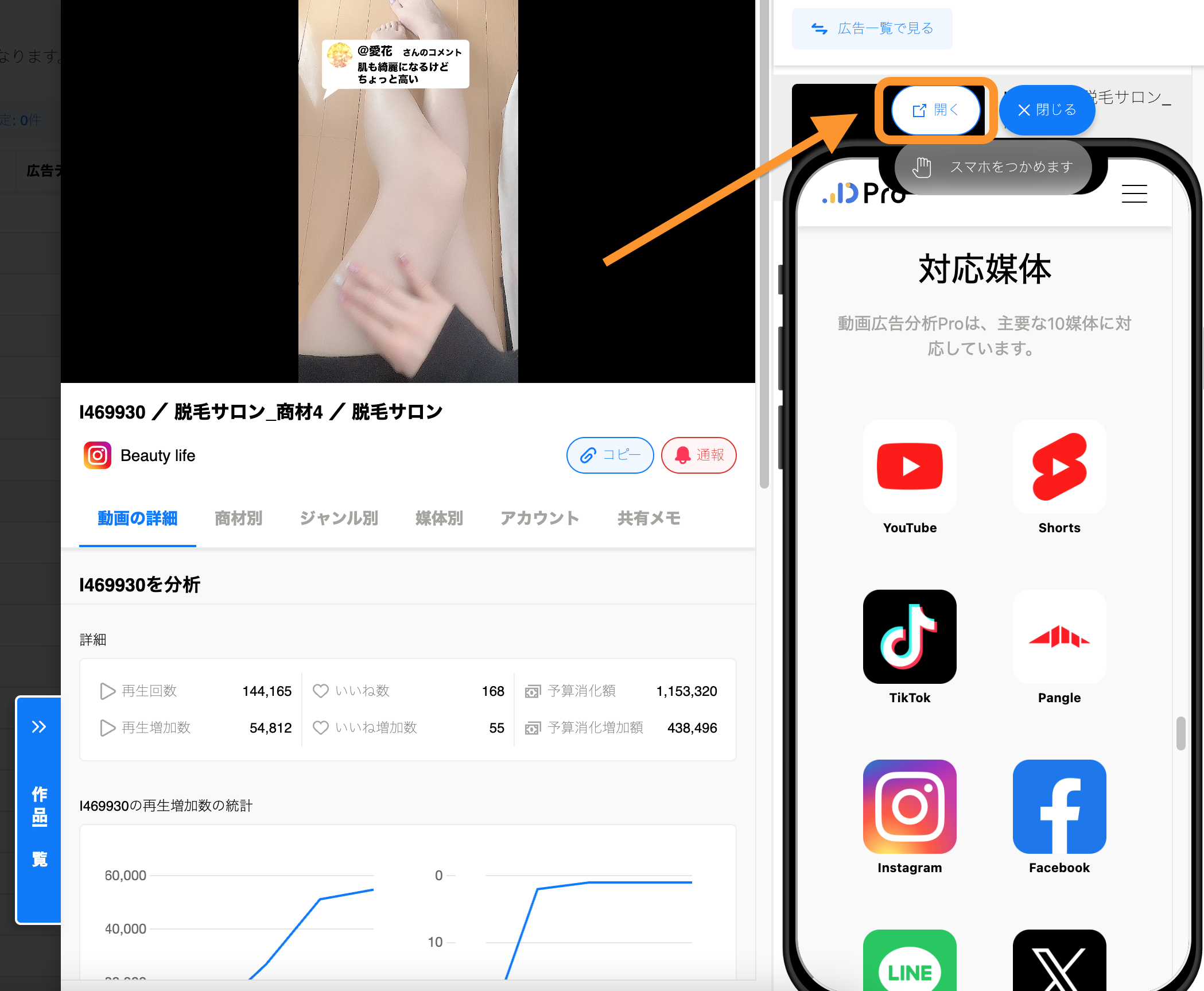 動画広告の遷移先ページは、詳細ページの[開く]をクリックすると、実際の遷移先が新しいタブで開きます。