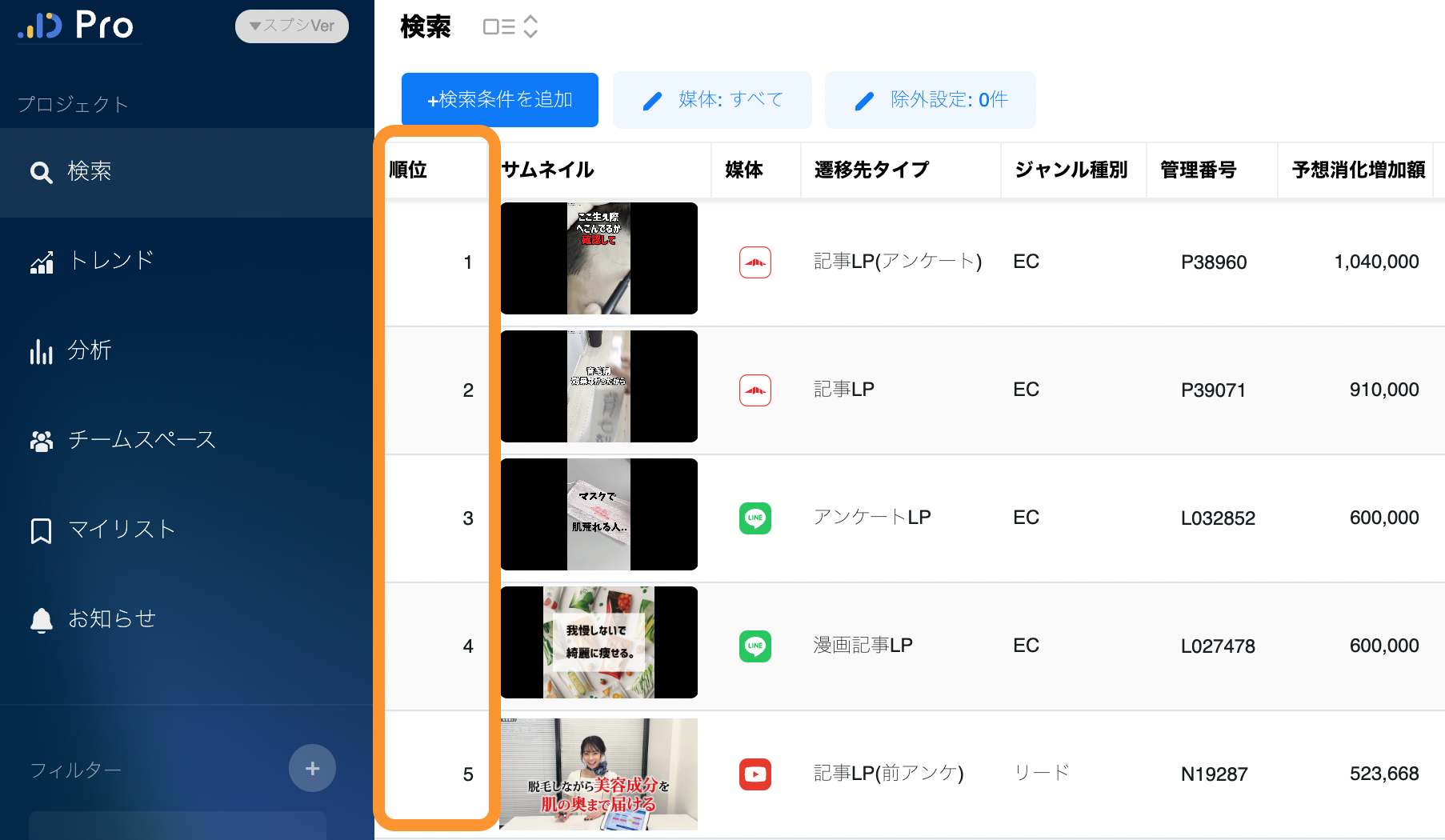 動画広告分析Proの項目の1つ、『順位』は、特定の基準に基づいて広告を昇順または降順に並べた際の、各広告の位置を示します。