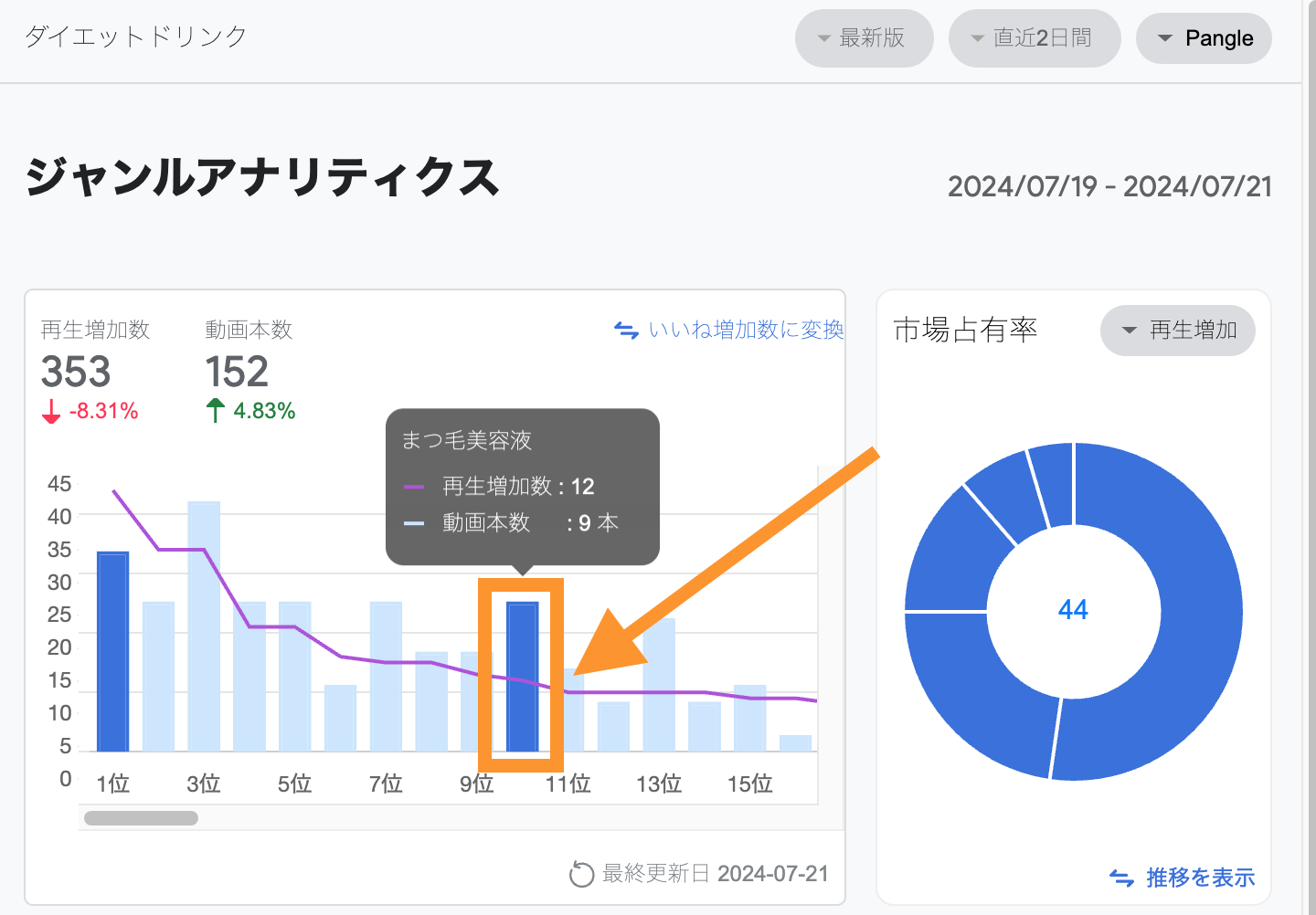 ①メニューの[トレンド]から[商材(ジャンル)ランキングアナリティクス] を開くと、ランキンググラフが表示されます。