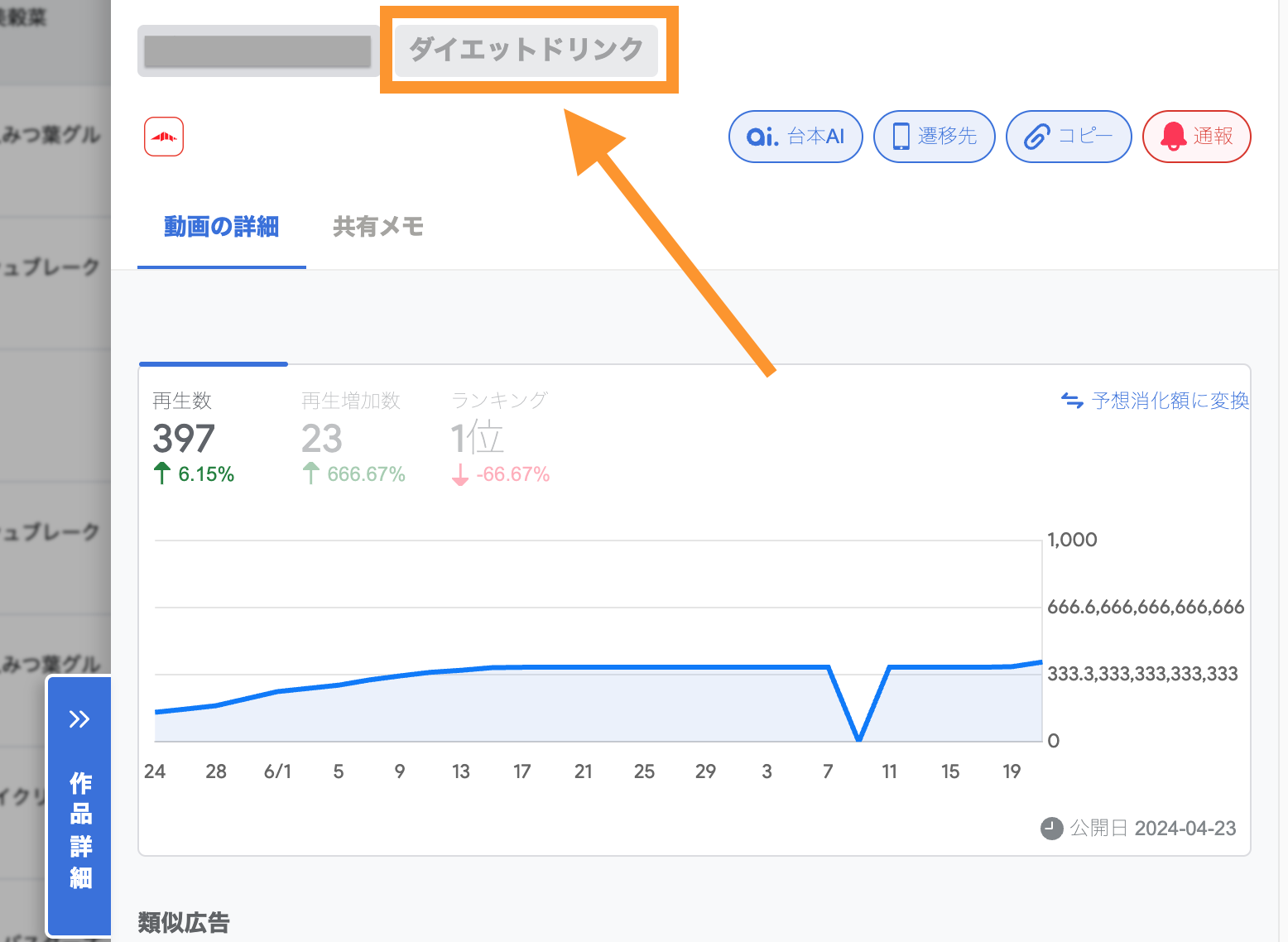 [ジャンルアナリティクス]から見たいデータをクリックし、他ジャンルの広告を開く。