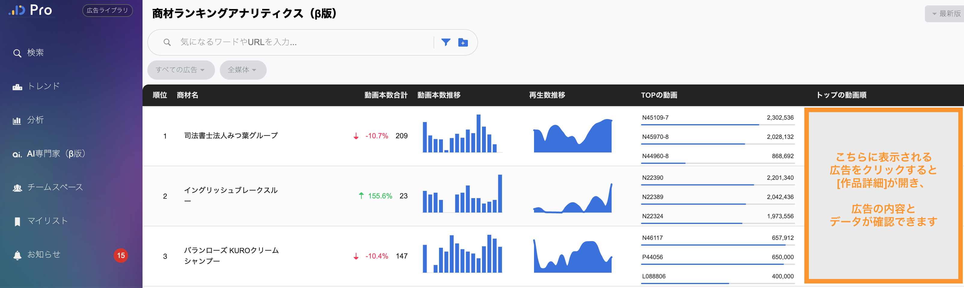 ②右側に広告一覧が表示され、気になる広告をクリックすると[作品詳細]が開き、広告の内容とデータを同画面でご確認いただけます。