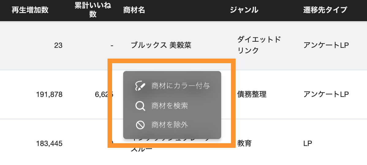 表データの「商品名」「ジャンル」のカラムに、右クリックで機能を呼び出せるようになりました。