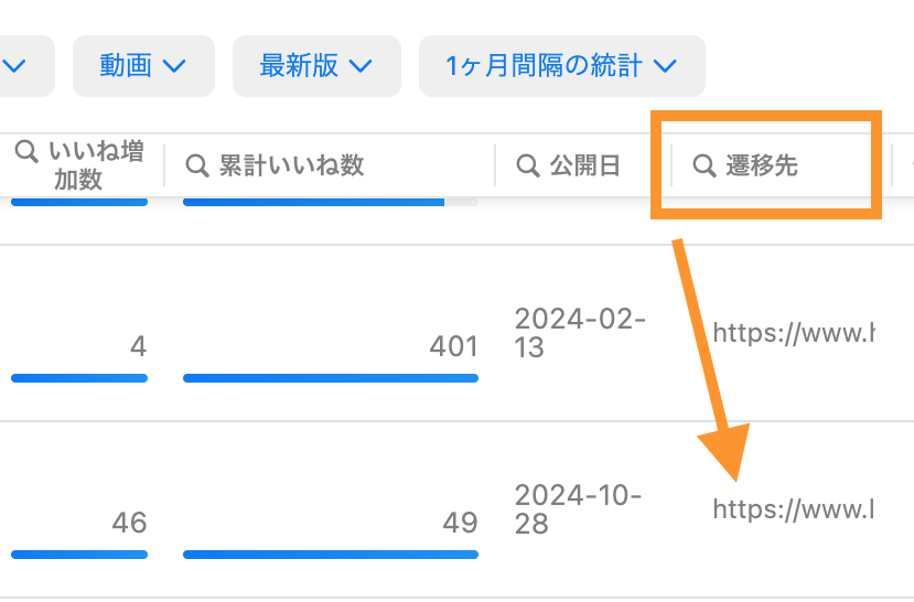 ①表データの[遷移先]のカラム列からURLをクリック